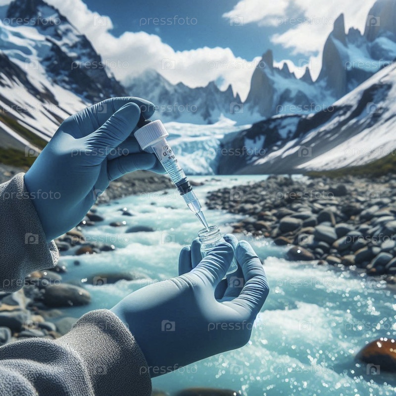 Команда ученых-экологов берет образец воды из нетронутой ледниковой реки, Ai generated image