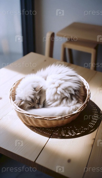 Кошка, свернутая и спящая внутри круглой ткани из ротана фруктовой корзины на деревянном столе, Ai generated image