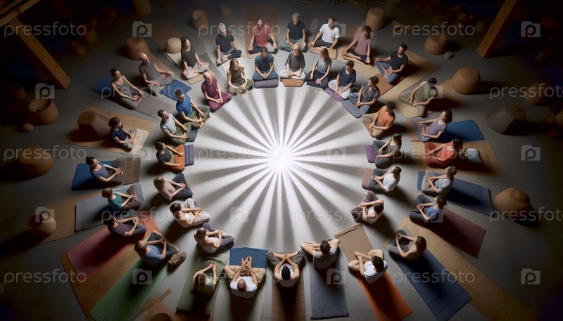 Глубокий момент осознания во время групповой медитации с руководством в спокойной студии, Ай создал изображение