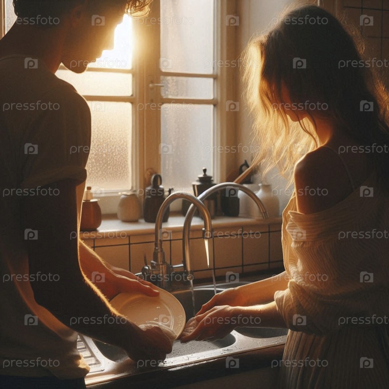 Пара делится тихой, понимающей улыбкой во время совместной посудомоечной работы после ужина, Ai generated image