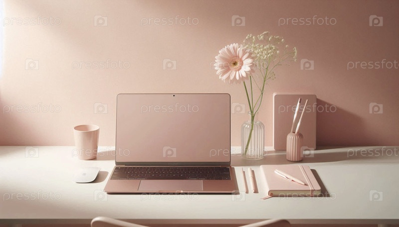 Минималистическое рабочее пространство с пастельно-розовым ноутбуком, одной ромашкой в стакане и изящным блокнотом, Ai generated image