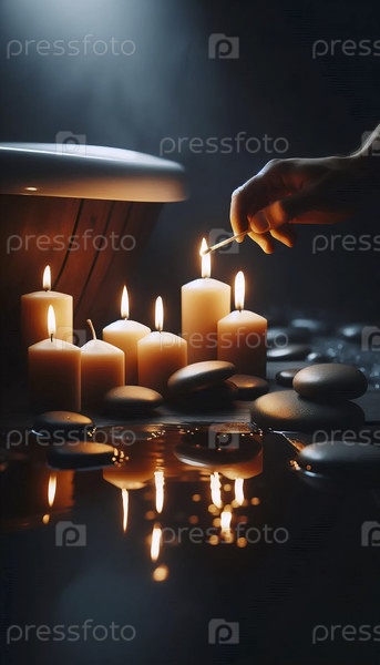 Спокойный вечерний ритуал зажигания свечей для цифровой детоксикационной ванны, Ai generated image