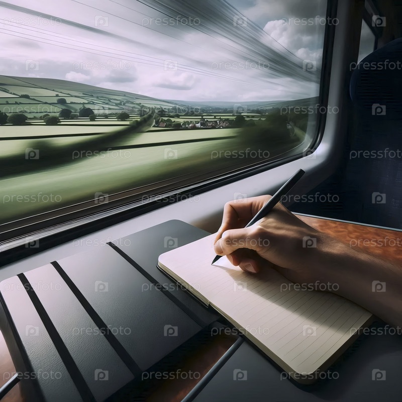 Одинокий писатель находит вдохновение во время поездки на поезде, записывая свои мысли в блокноте против размытого пейзажа, Ai generated image