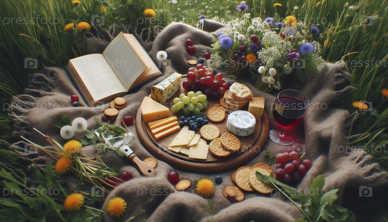 Красиво оформленная сырная доска и вино на пикничном одеяле в цветущей весенней лужайке, Ай создал изображение