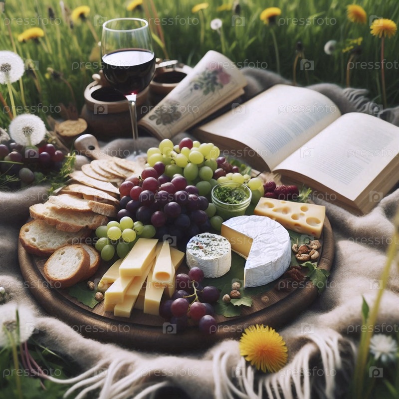 Красиво оформленная сырная доска и вино на пикничном одеяле в цветущей весенней лужайке, Ай создал изображение
