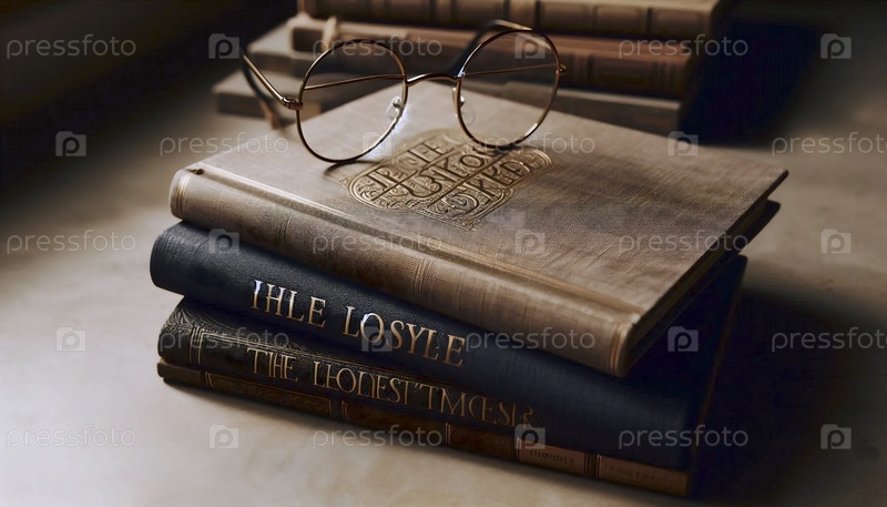 Стол из трех красивых книг в жесткой обложке с текстурированными крышками и парой круглых очков на вершине, Ай создала изображение