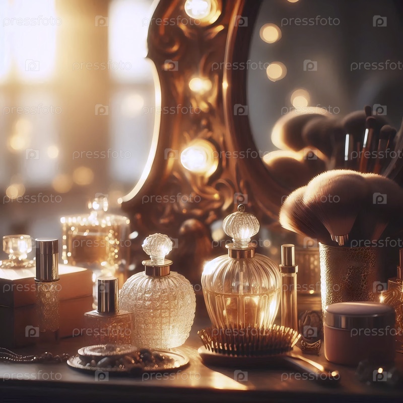 Хорошо организованный, эстетичный стол для тщеславия с бутылками парфюмерии, попадающими в золотое время света, Ай создал образ