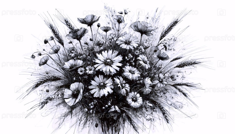Букет дикорастущих цветов чернил Чернила чернила A ink drawing art print, Ai generated image