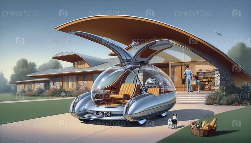 Утонченный, семейного размера Aero-Car со складывающимися крыльями, припаркованный на пригородной дорожке будущего, Ai создал изображение