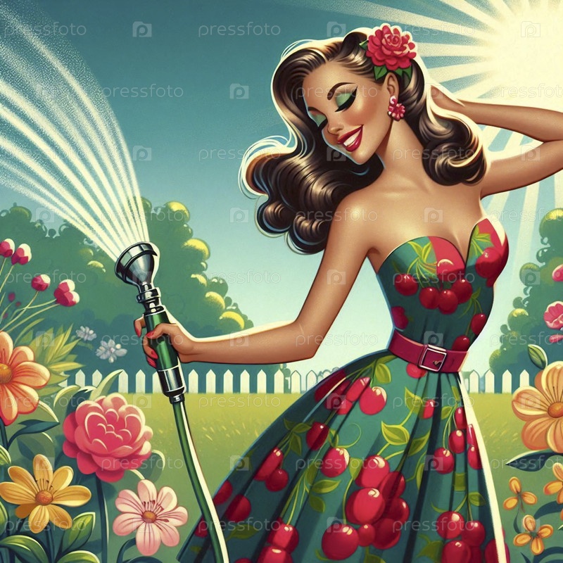 Пин-ап девушка в цветочном платье поливает пышный сад винтажным шлангом, Ai generated image