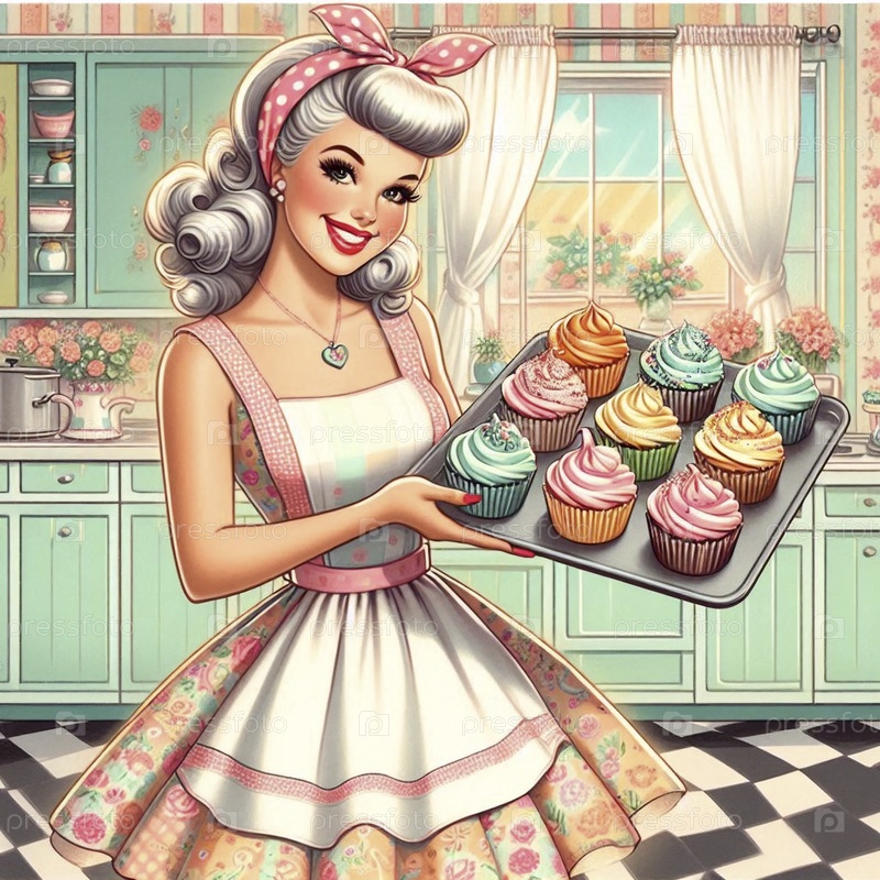 Пин-ап девушка как пекарня, держащая поднос с идеальными тортами, Ai generated image