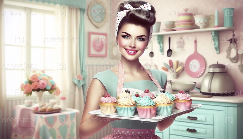 Пин-ап девушка как пекарня, держащая поднос с идеальными тортами, Ai generated image