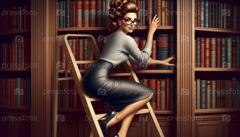 Пин-ап девушка в библиотеке, стоящая на подвижной лестнице, Ai generated image