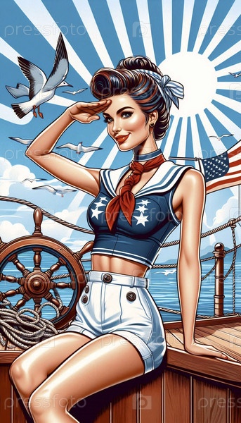 Патриотическая девушка в роли моряка на палубе корабля, Ai generated image