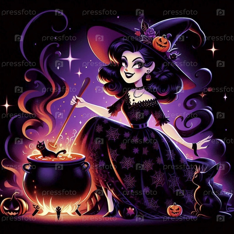 Виртуальная ведьма смешивает волшебный котел на Хэллоуин, Ai generated image