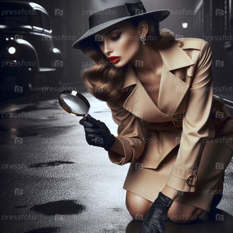 Девушка-принтер в роли детектива с увеличительным стеклом, расследующей подсказки, Ai generated image