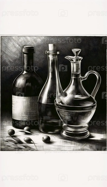 Вино и оливковое масло бутылки чернила рисование художественная печать, Ai generated image