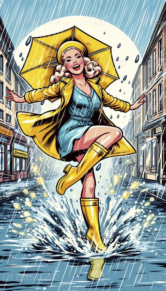 Пин-ап девушка в плаще и сапогах, прыгающая в пруд, Ai generated image