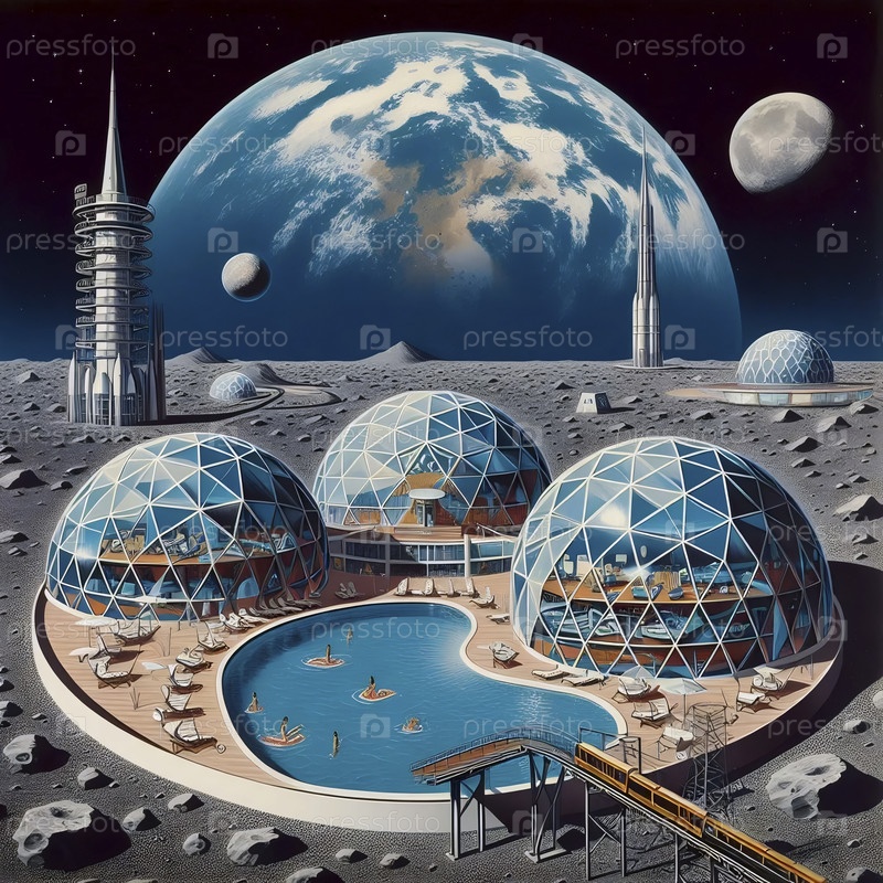 Плакат "Отдых на Луне", показывающий курорт со стеклянными куполами и восходом Земли, Ai создал изображение