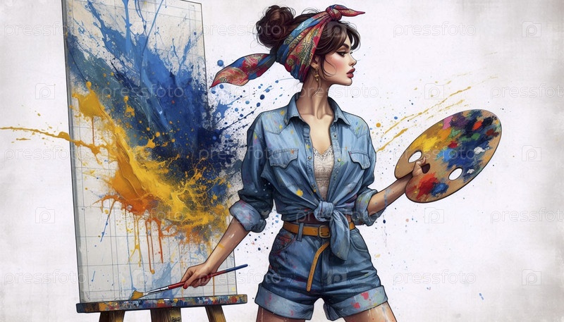 Девушка-художница, рисующая большое полотно с смелыми штрихами, Ai generated image