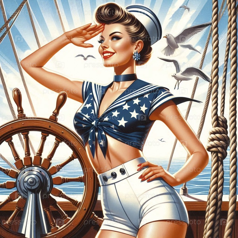 Патриотическая девушка в роли моряка на палубе корабля, Ai generated image