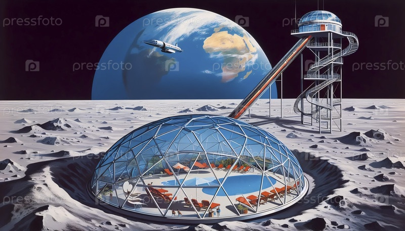 Плакат "Отдых на Луне", показывающий курорт со стеклянными куполами и восходом Земли, Ai создал изображение