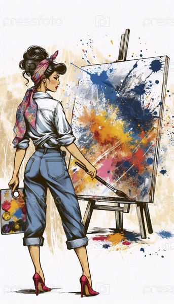 Девушка-художница, рисующая большое полотно с смелыми штрихами, Ai generated image
