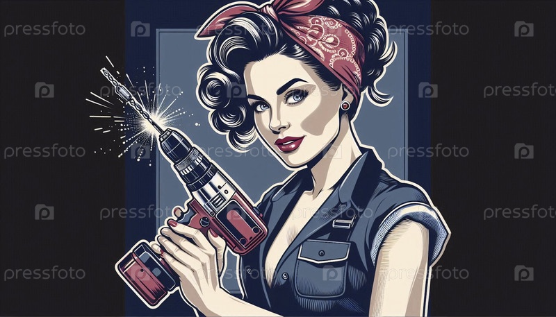 pin-up Fix It Девушка уверенно держит тяжелую буровую установку, Ai generated image