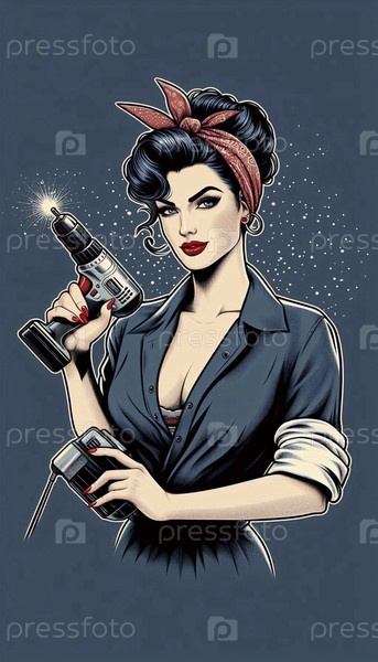 pin-up Fix It Девушка уверенно держит тяжелую буровую установку, Ai generated image
