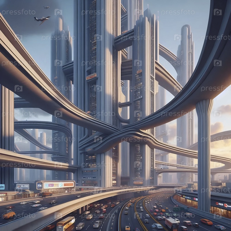 Многоуровневый мегаполис с элегантными летательными аппаратами, ориентирующимися через колоссальные изогнутые эстакады, Ai generated image