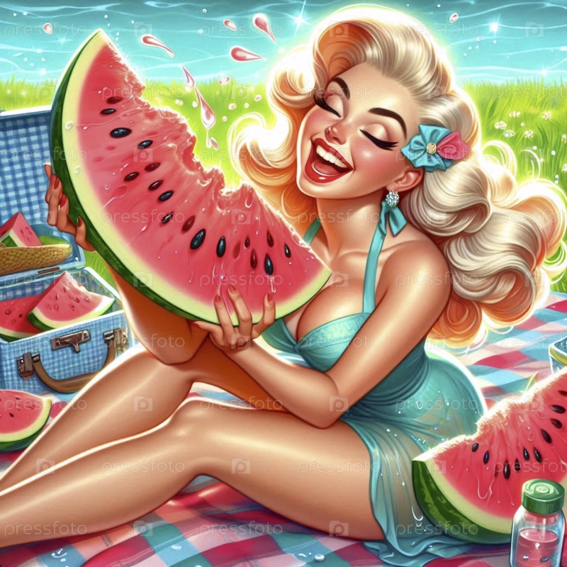 Загнутая девушка в пин-апе с гордостью держит гигантский кусочек мидии, Ai generated image