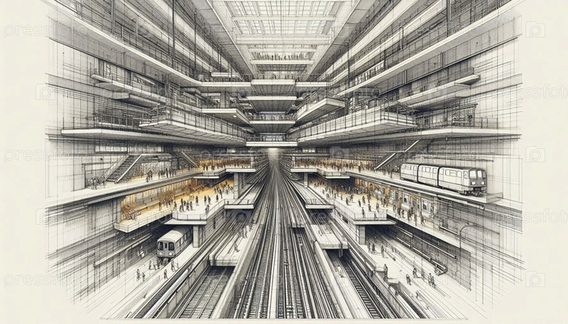 Поперечное сечение станции метро чернильным рисунком художественная печать, Ai generated image