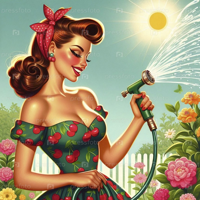 Пин-ап девушка в цветочном платье поливает пышный сад винтажным шлангом, Ai generated image