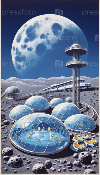 Плакат "Отдых на Луне", показывающий курорт со стеклянными куполами и восходом Земли, Ai создал изображение