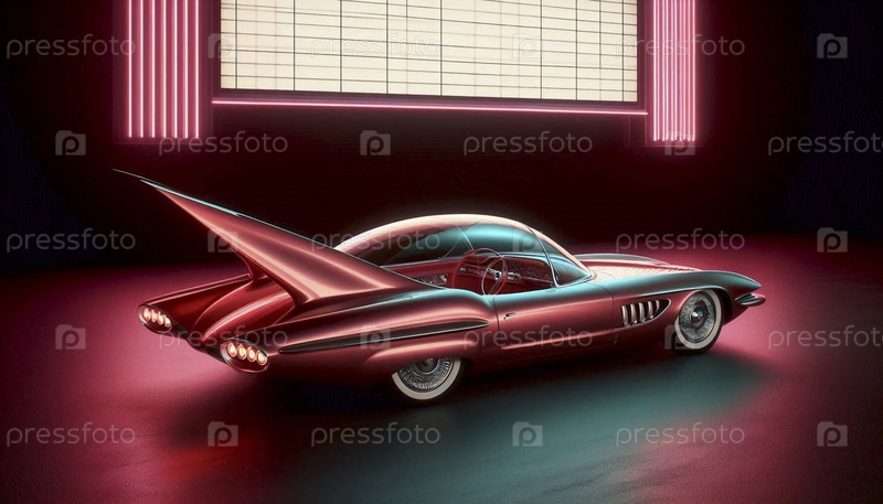 Низкий атомный купе с драматическими хвостовыми крыльями и панорамным стеклянным навесом, припаркованное у драйв-ина, Ai generated image