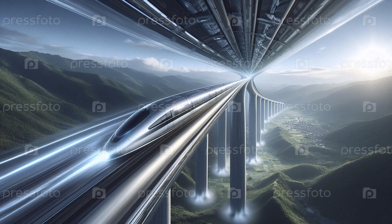 Высокоскоростной вакуумный поезд, стреляющий через прозрачную трубу по панорамному ландшафту, Ai generated image