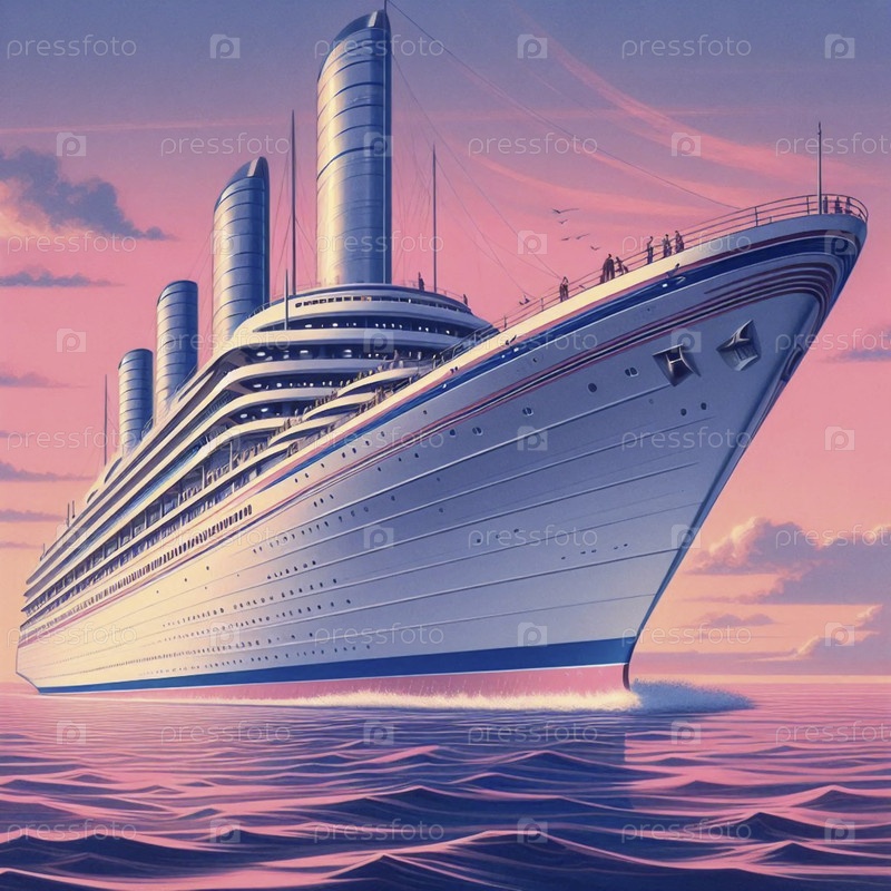 Роскошный океанский лайнер будущего с несколькими террасовыми палубами и атомными двигателями, плавающий на закате, Ai generated image