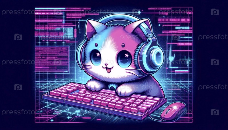 Киберкавайи иллюстрация сбоя кошачьего хакера, Ai generated image