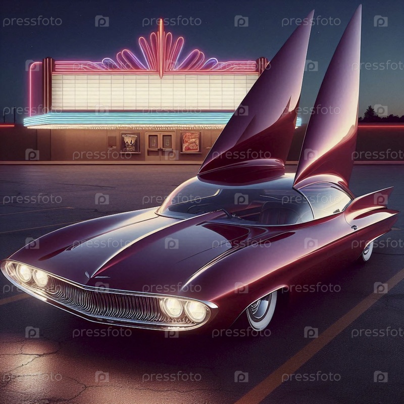 Низкий атомный купе с драматическими хвостовыми крыльями и панорамным стеклянным навесом, припаркованное у драйв-ина, Ai generated image
