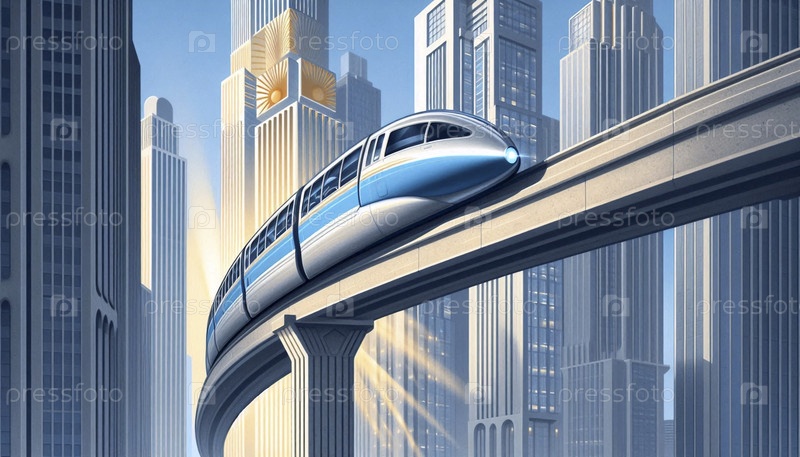 Оптимизированный монорельсовый поезд, плавающий тихо по одной поднятой дорожке через футуристический центр города, Ai generated image