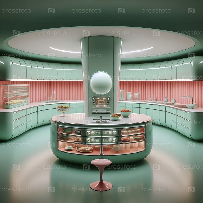 Ретро-футуристическая кухня со всеми приборами, встроенными в изогнутые пастельные панели управления, Ai generated image