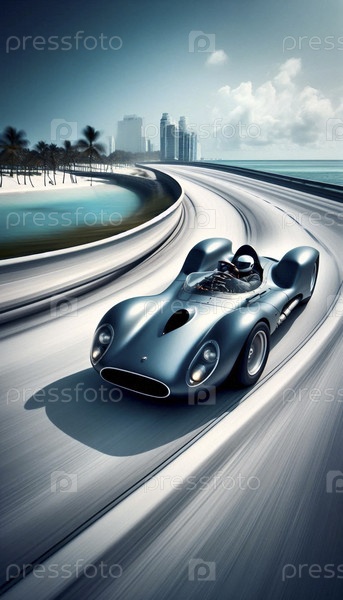 Трехколесный Jetcar с входом турбинового двигателя и одним задней крышкой, ускоряющийся по береговому шоссе, Ai generated image