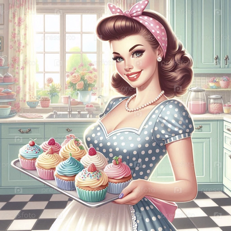 Пин-ап девушка как пекарня, держащая поднос с идеальными тортами, Ai generated image