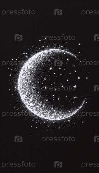 Полумесяц Луна и звезды чернила рисунок художественная печать на черном, Ai generated image