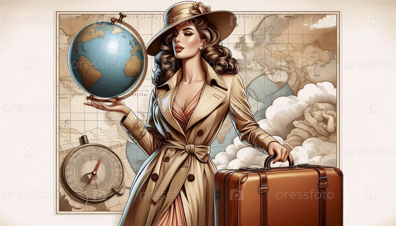 Пин-ап девушка с чемоданом и земным шаром, готовая к приключениям, Ai generated image