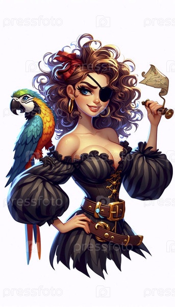 Пин-ап девушка, одетая в пирата с попугаем на плече, Ai generated image