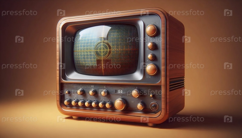 Телевизор из деревянных панелей с большим, выпуклым зеленым экраном и рядами аналоговых циферблат Ai генерирует изображение