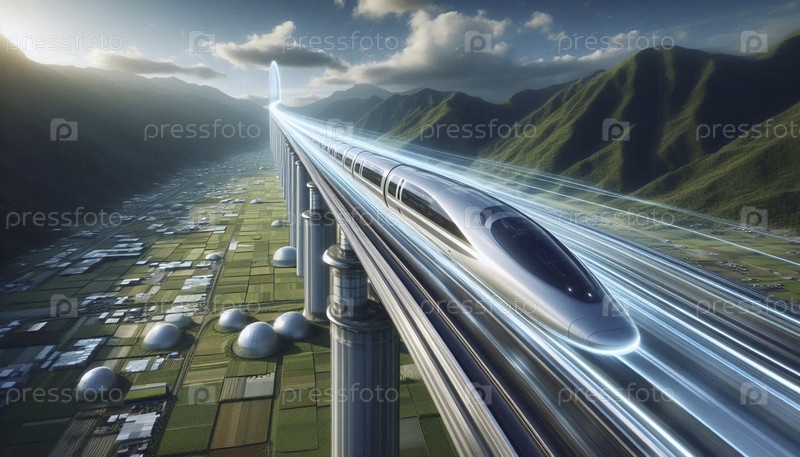 Высокоскоростной вакуумный поезд, стреляющий через прозрачную трубу по панорамному ландшафту, Ai generated image