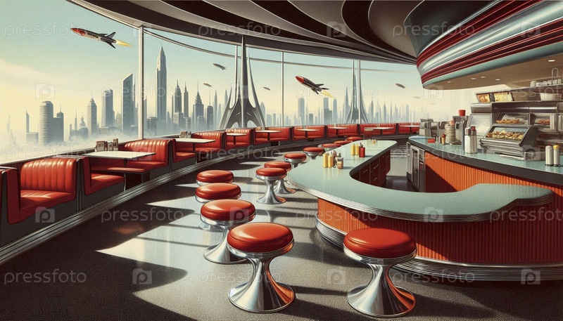 Обеденный стол с стульями, которые выглядят как конусы носа ракеты, под волнистой крышей волны, Ai generated image