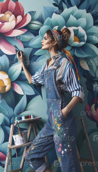 Девушка, нарисованная в качестве художника, украшающего большую стену цветочной росписью, Ай создала изображение